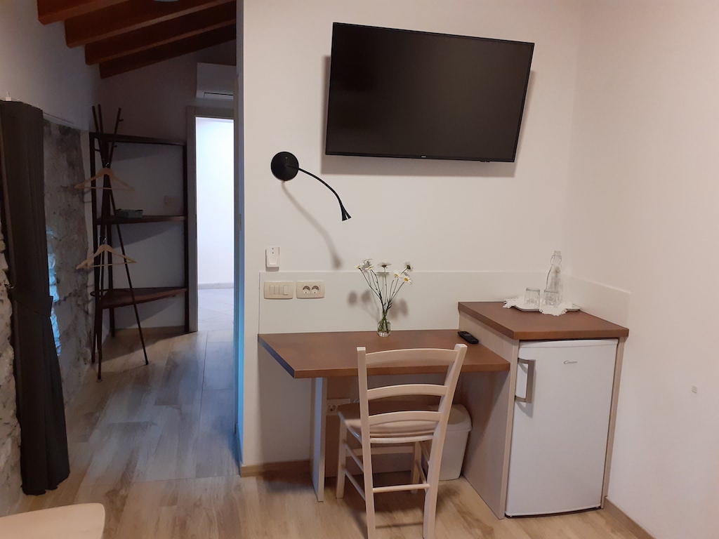 Je prostorna soba za tri osebe z zakonsko in enojno posteljo ter kopalnico. V prostoru je tudi manjša mizica in hladilnik.V sobi je klimatska naprava, TV sprejemnik in Wi-Fi.